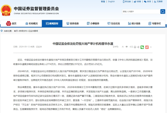 专题:涉恒大地产财务造假 证监会:对普华永道处以顶格罚款2.97亿元